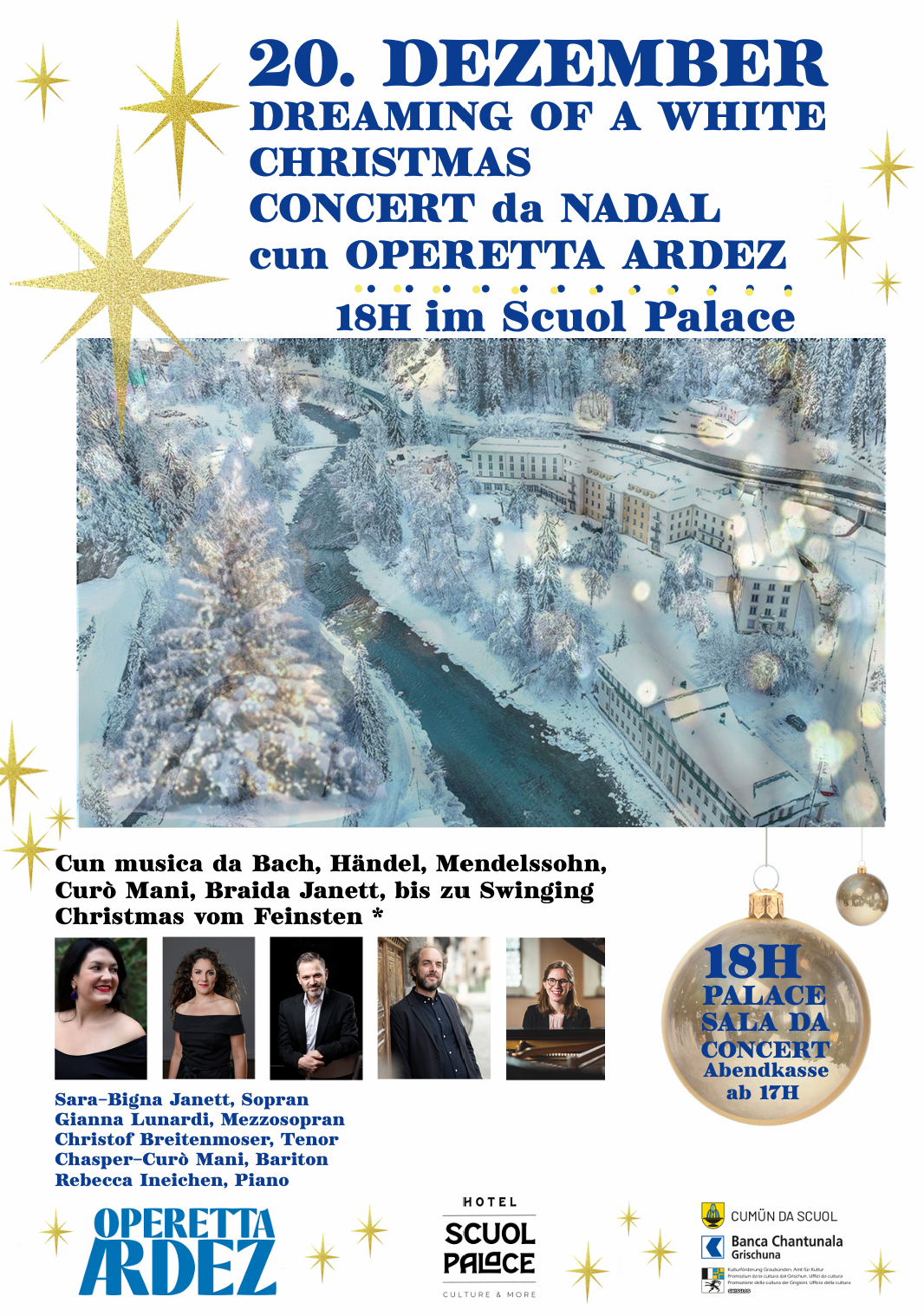 Concert da Nadal cun Operetta Ardez Cun musica da J.S. Bach, G. F. Händel, Romanisches/Romantisches da Felix Mendelssohn, Curò Mani, Braida Janett u.a., bis „Swinging Christmas“ vom Feinsten!Sara-Bigna Janett, SopranGianna Lunardi, MezzoChristof Breitenmoser, TenorChasper-Curò Mani, BaritonRebecca Ineichen, PianoDas Vokalquartett um Sara-Bigna Janett, Gianna Lunardi und Chasper-Curò Mani, bestens bekannt aus Produktionen von der OPERETTA ARDEZ […]
